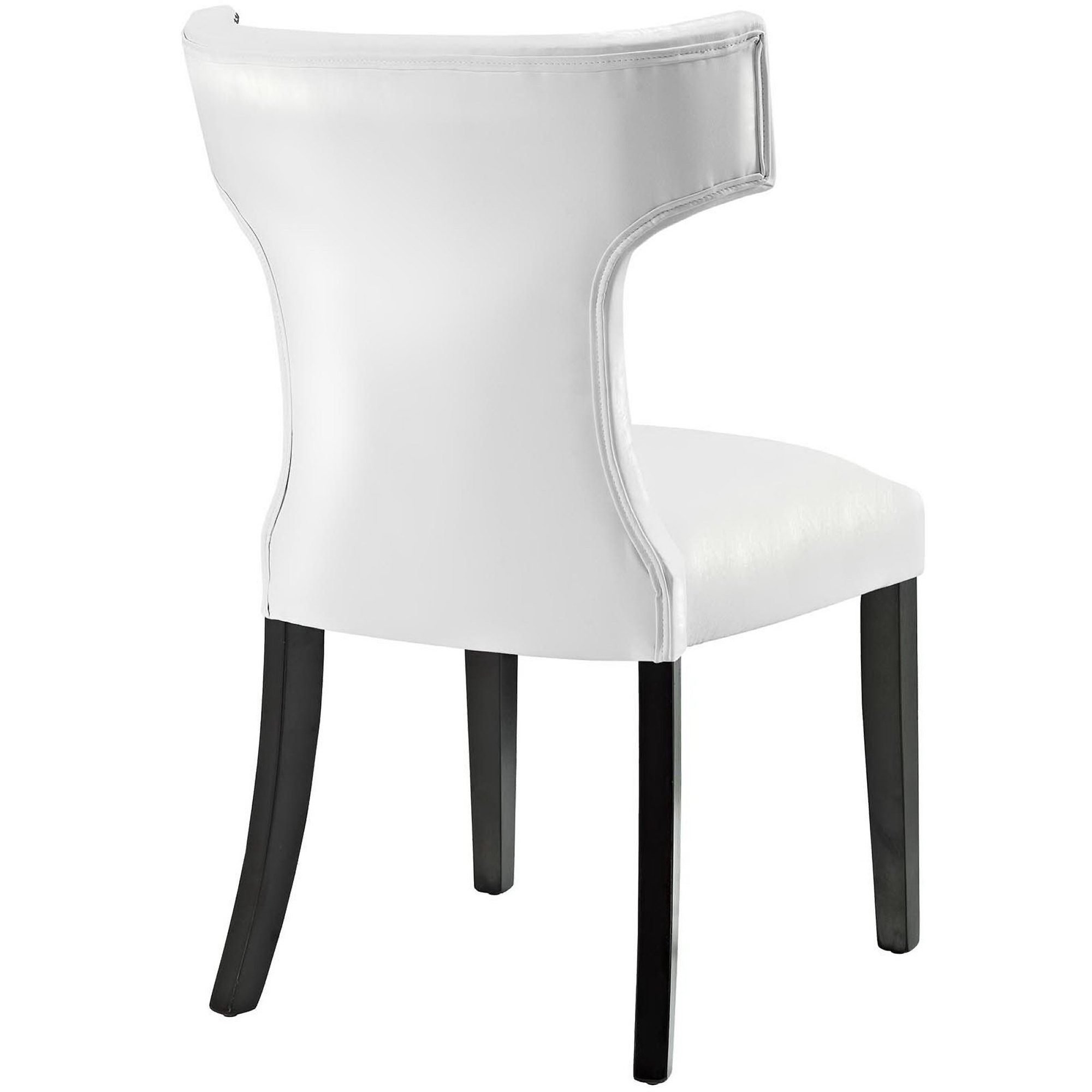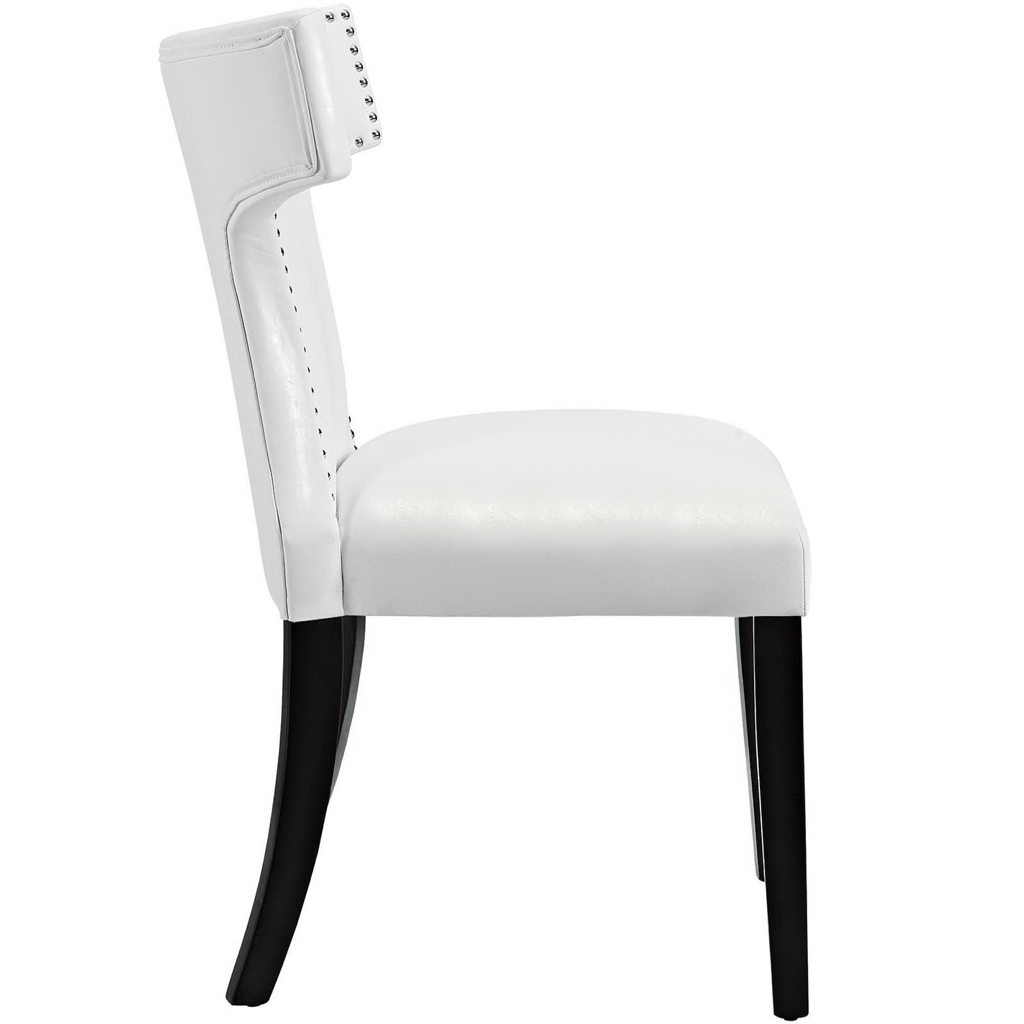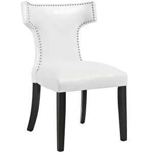 Transform your dining decor with the broadly designed Curve Dining Side Chair. Sweeping lines complement a minimalist shape for a chic look studded with nailhead trim. Curve comes generously padded with dense foam covered in vinyl, non-marking foot caps, and delivers just the right touch of finesse with tapered wood legs. Sporting an hourglass shape, Curve works well in a variety of dining room arrangements.