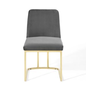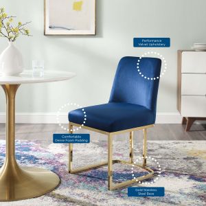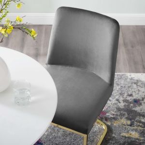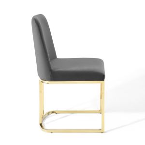 Striking lines and simple form blend to produce the Amplify Glam Deco Performance Velvet Upholstered Sled Base Dining Chair. A boldly flowing gold stainless steel sled base supports the premium seating experience produced by the soft and stain-resistant performance velvet polyester upholstery for a dining chair suitable for a variety of decor styles. Dense foam padding and gentle curves accent the glam deco elegance of the Amplify Dining Side Chair. Whether the Amplify Accent Chair is gracing your dining room, living room, lounge room, or office, visitors and guests will comment on this eye-catching addition. Chair Weight Capacity: 331 lbs. Assembly Required.