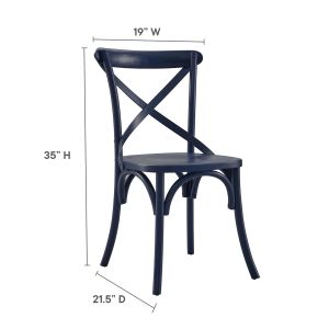 Introduce feelings of nostalgia as you gather around the dining table for a quick breakfast or dinner with friends with the Gear Dining Side Chair. Blending farmhouse charm with modern style, this dining chair features an X-brace back and stretchers between splayed legs. With non-marking foot caps to protect flooring, this side chair is durably crafted with durable elm wood for a sturdy construction built to last. Make a statement in your dining space or kitchen nook with this versatile wood dining chair that can also be used as an accent chair in a living room or desk chair in a home office. Weight Capacity: 330 lbs. Set Includes: One - Gear Dining Side Chair