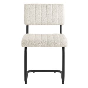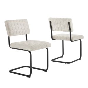 Bring mid-century style to your dining space with the Parity Dining Chairs - Set of 2. These side chairs feature perfectly textured boucle fabric upholstery that is channel tufted for a retro modern look. The powder-coated tubular metal frames provide a sleek silhouette and superior durability with a weight capacity of 330 lbs. Resting on a sled base, these dining chairs are equipped with non-marking foot pads to protect flooring and dense foam padding for added comfort and support. With both retro modern and vintage style, this set of two dining side chairs brings a unique flair to your dining room, kitchen space, or living area. Assembly is required. Set Includes: Two - Parity Boucle Dining Side Chairs - Set of 2